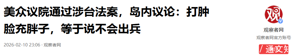 2026-02-10 23:06·观察者网 美众议院通过涉台法案,岛内议论:打肿脸充胖子,等于说不会出兵